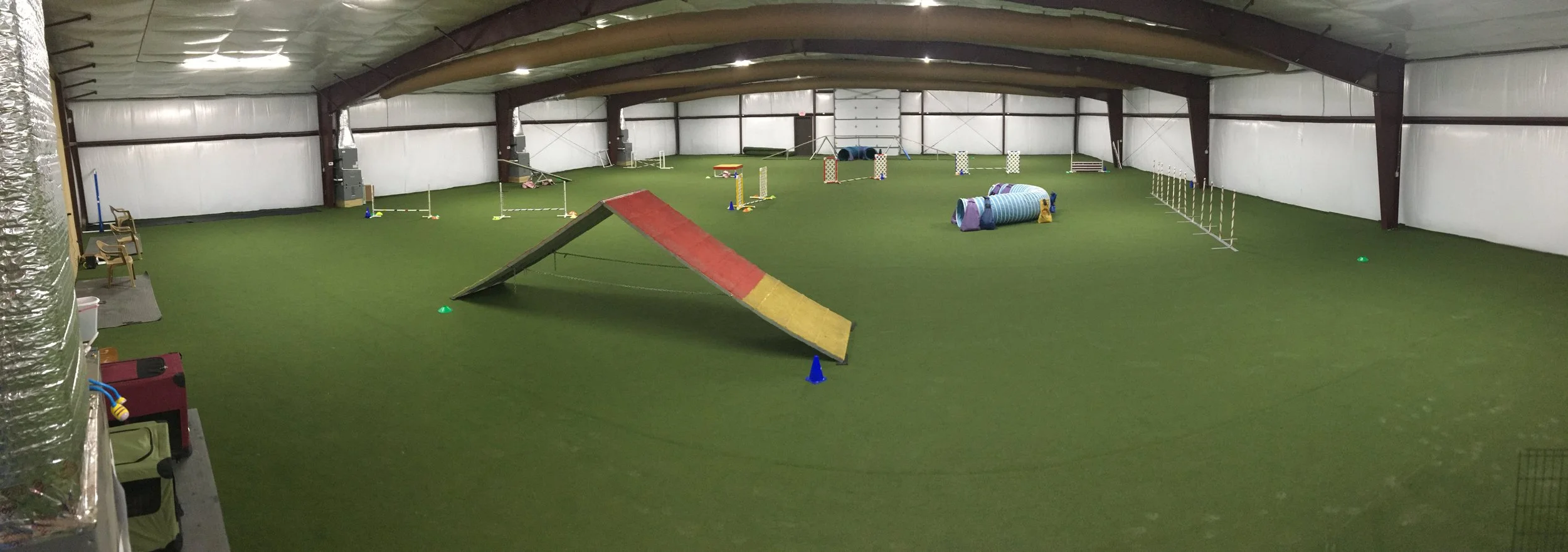 Our building is a 8,500 square foot building with AC, heat, and artifical turf. Lots of grass for walking.